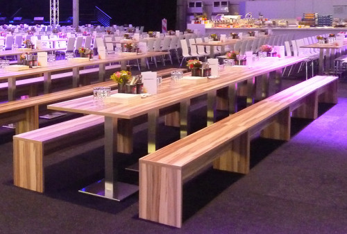 Die Event Rent GmbH wächst im doppelten Sinne des Wortes mit ihren Aufgaben. Eine der großen Herausforderungen des ersten Halbjahres 2014 waren beispielsweise Tage der offenen Tür eines Unternehmens mit ca. 40.000 Gästen. Mehr als 16.000 Quadratmeter unterschiedlicher Bodenbelag wurden dazu auf dem gesamten Veranstaltungsgelände verlegt. Hinzu kam die gesamte Möblierung mit insgesamt rund 8.000 Sitzmöglichkeiten für einen großen Lounge Bereich, den Biergarten sowie die große Festhalle. Die Köstlichkeiten für das leibliche Wohl gelangten über rund 160 Meter LED gesteuerte Buffettheke und 120 Meter Getränketheke an ihr Ziel. „Die Chance solch eine Veranstaltung ausstatten zu können, bekommt man nur selten. Das Gefühl, wenn man nach mehr als 40 Sattelzügen und unzähligen Arbeitsstunden auf das Ergebnis blickt, ist unbeschreiblich“, erzählt der Unternehmer mit einem gewissen Strahlen in den Augen.